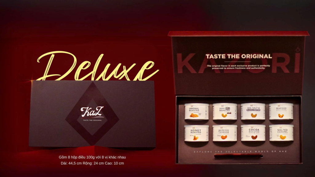 Kaz linh hoạt kết hợp cùng các sản phẩm khác như trà, cà phê, rượu vang hoặc đặc sản vùng miền để tạo nên hộp quà hài hòa giữa hương vị, dinh dưỡng và thẩm mỹ.